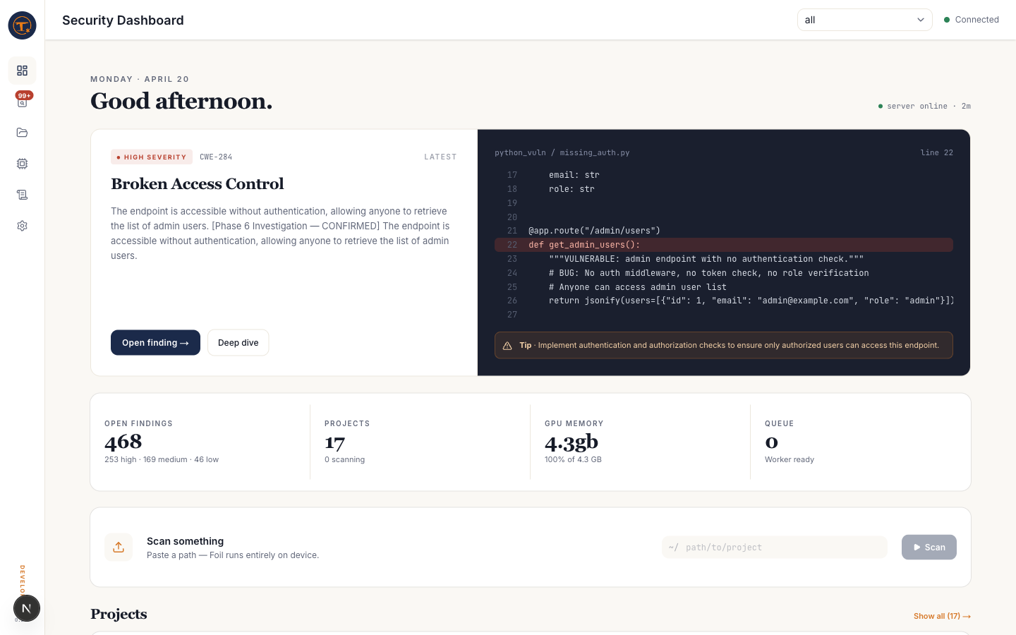 - Latest HIGH finding — a featured card for the newest HIGH in the most recently scanned project, so you can jump straight from "I just scanned" to "here's what matters"