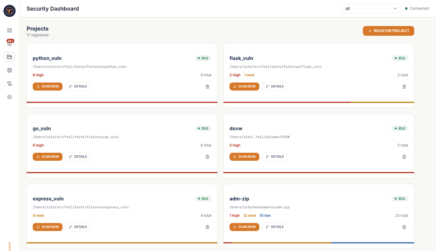 foil scan <path>. This is a standard scan only — to run a deep scan or generate a PDF report you need to open the Project detail page.