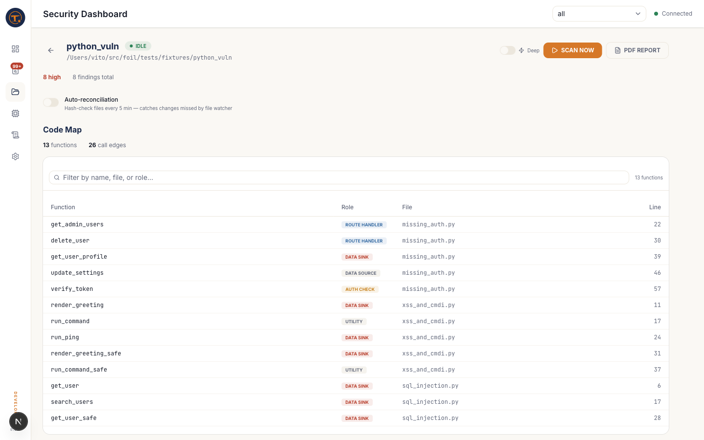- Deep — standard scan plus a Phase 6 investigation loop for every HIGH logic-class finding (IDOR, broken auth, broken access). Adds 30–90s per HIGH finding. Developer edition only, and only triggerable from the Project detail page.
